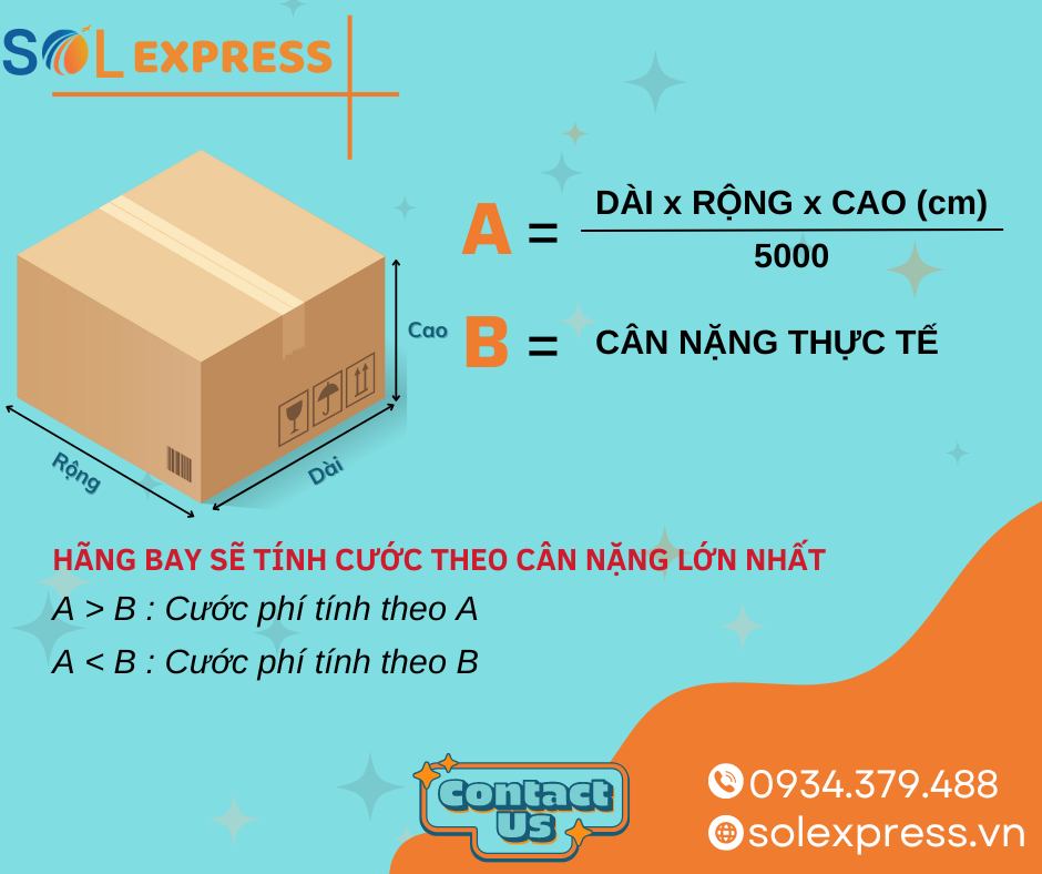 Tính Cân nặng Thể tích (Volumetric Weight) bằng công thức: (Dài x Rộng x Cao) / 5000.